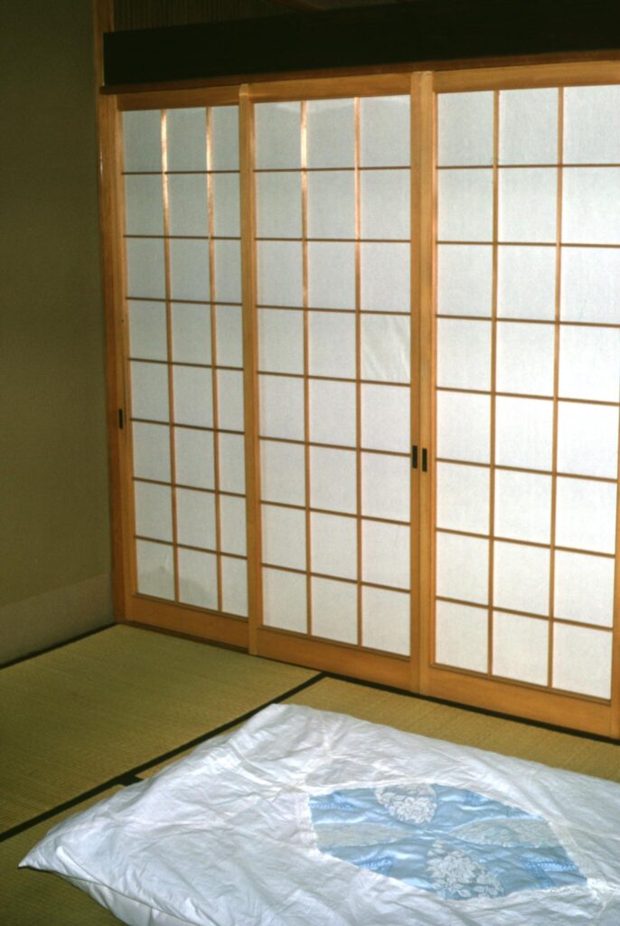 Im Zimmer steht lediglich ein etwa 30 cm hoher Tisch, auf dem zum Empfang grüner Tee und für die Region typisches Gebäck bereit steht. Am Abend wird der Tisch von Bediensteten in einen Nebenraum gestellt und die Futons auf den Tatami-Matten als Nachtlager ausgebreitet. Am Morgen werden sie wieder entfernt. Selbstverständlich kleiden wir uns in die bereit gelegten Kimonos und fühlen uns während des Nachtessens fast wie „echte Japaner“.