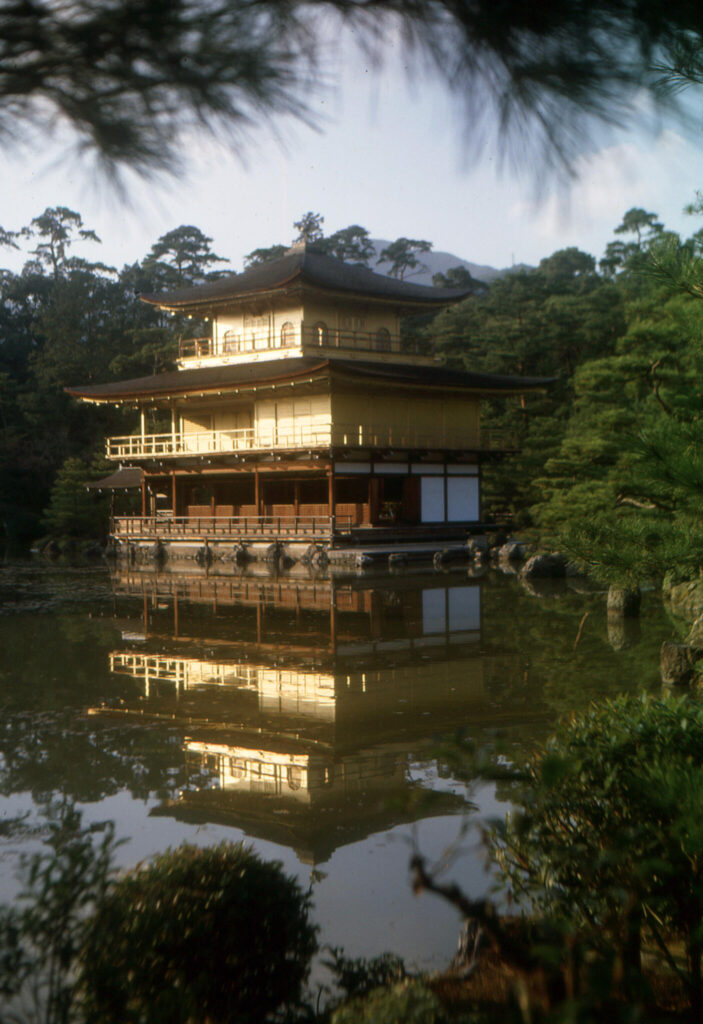 Der Goldene Pavillon wurde 1397 erbaut und 1950 durch Brandstiftung durch einen buddhistischen Kleriker zerstört. Als Grund gab er an, dass er die Schönheit dieses Tempels nicht mehr ertragen konnte und ihn zerstören musste. 1955 wurde der Tempel aufgrund der Originalpläne wieder naturgetreu neu aufgebaut.