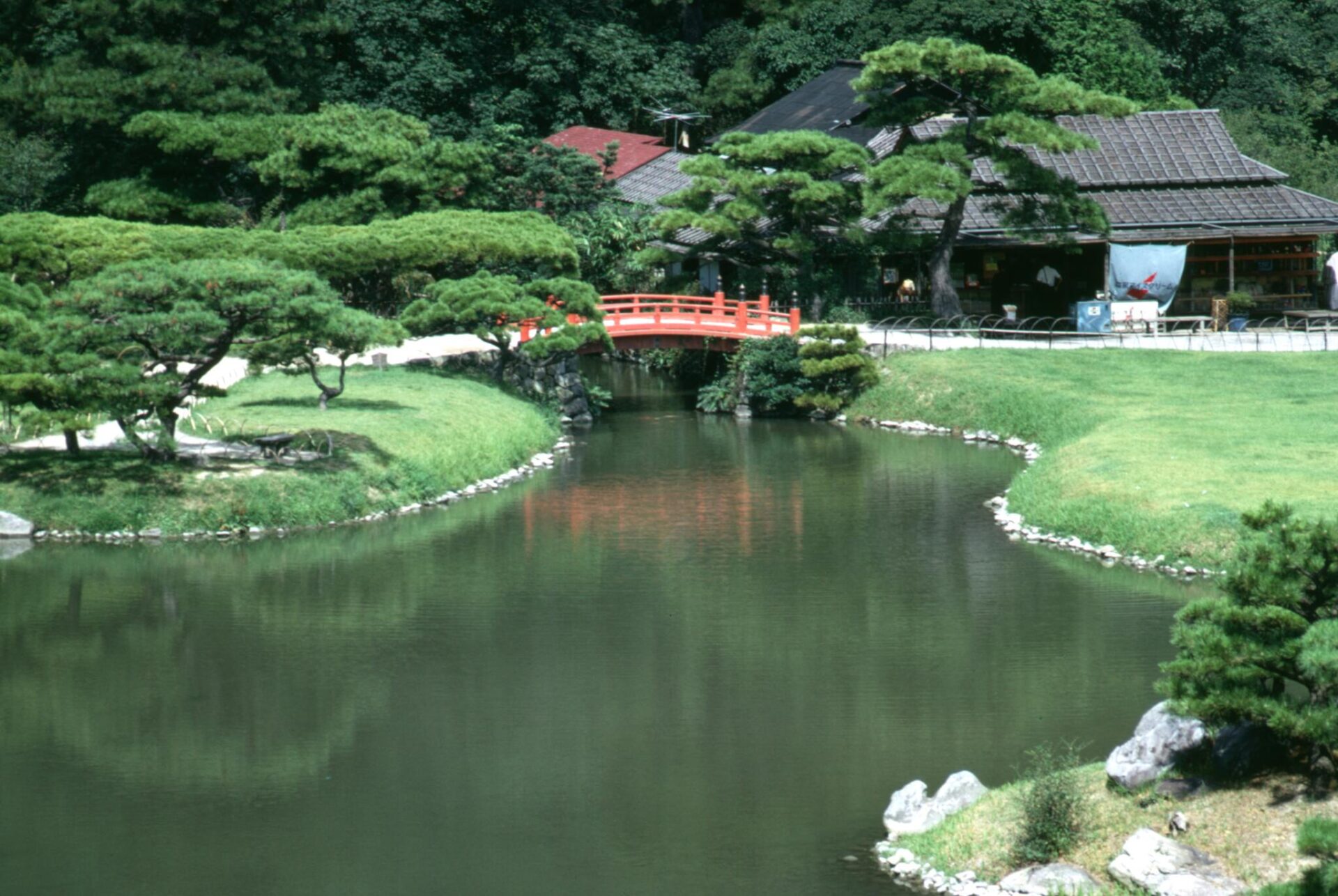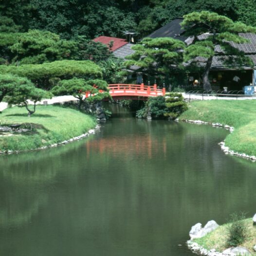 Ein fantastischer und sehr gross angelegter japanischer Landschaftsgarten. Unzählige Bäume, knorrige Kiefern, Lotusteiche, kleine unterschiedliche Brücken und ein kleiner Hügel im Hintergrund bieten immer wieder spektakuläre Ausblicke.