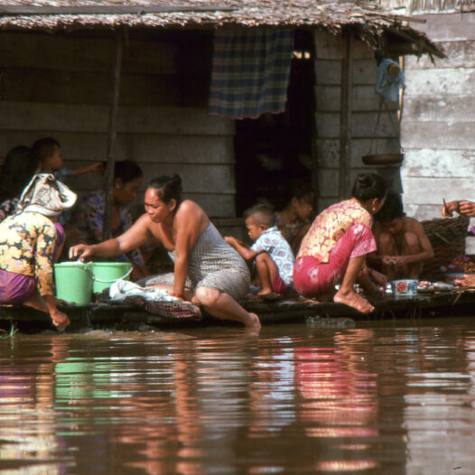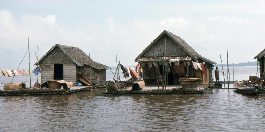 Hier sehen wir, wie die Leute in Hütten auf Flossen leben am Rande eines Sees. Sie sind verankert mit langen Stangen und heben und senken sich je nach Wasserstand, sodass es keine Überschwemmung gibt.