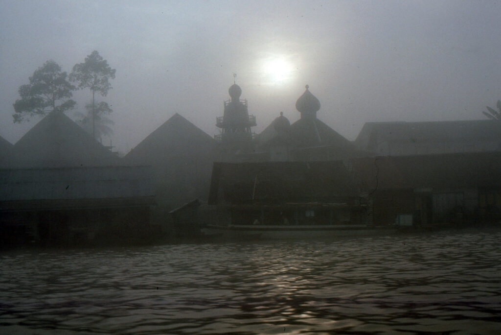 An einem frühen Morgen fahren wir dem Dorf entlang, das noch in Nebel gehüllt ist und wir die Moschee und umliegenden Häuser nur mit einer gespenstisches Silhouette wahrnehmen können.
