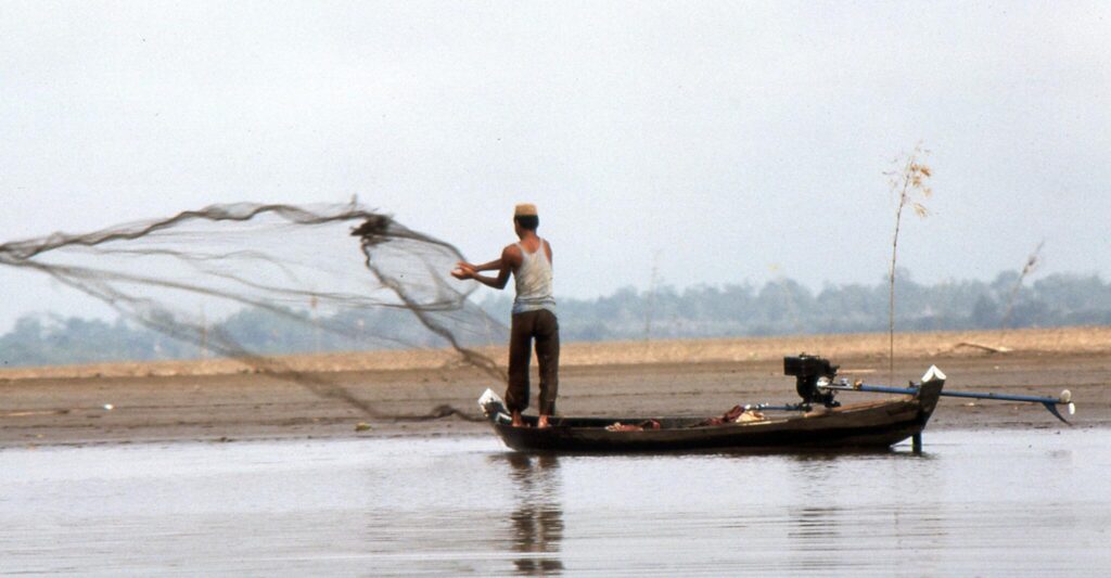 Auch treffen wir einsame Fischer in langen schmalen Kanus stehend und wie sie ihre Fischernetze in hohem Bogen auswerfen.